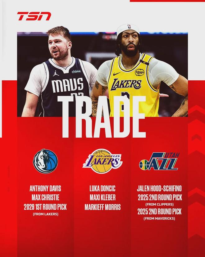 湖人得到東契奇+克萊伯+莫里斯+5.5萬美元(來自爵士);