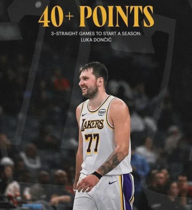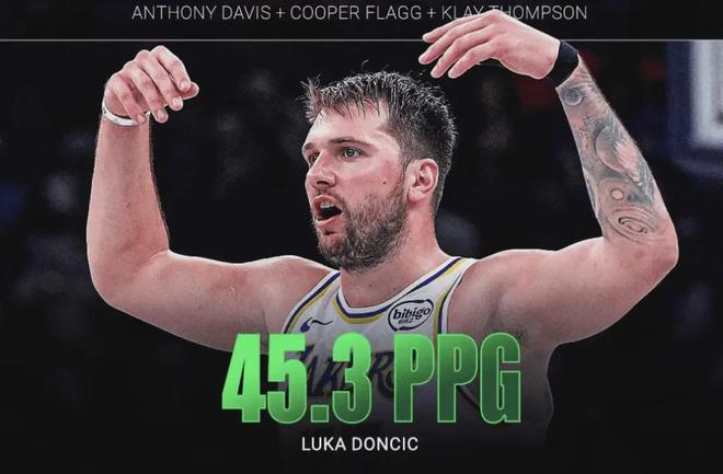 本賽季至今,湖人球星東契奇場均45.3分,而湯普森(8.7分)+濃眉哥(20.8分)+弗拉格(13.8分)場均合計才43.3分。