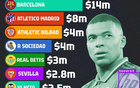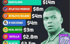 西甲袖標贊助榜:皇馬2500萬美元居首、巴薩馬競分列二三