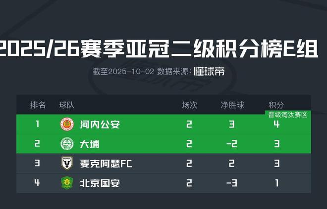 亞冠二積分榜:國安2輪1分墊底,河內(nèi)積4分領(lǐng)跑