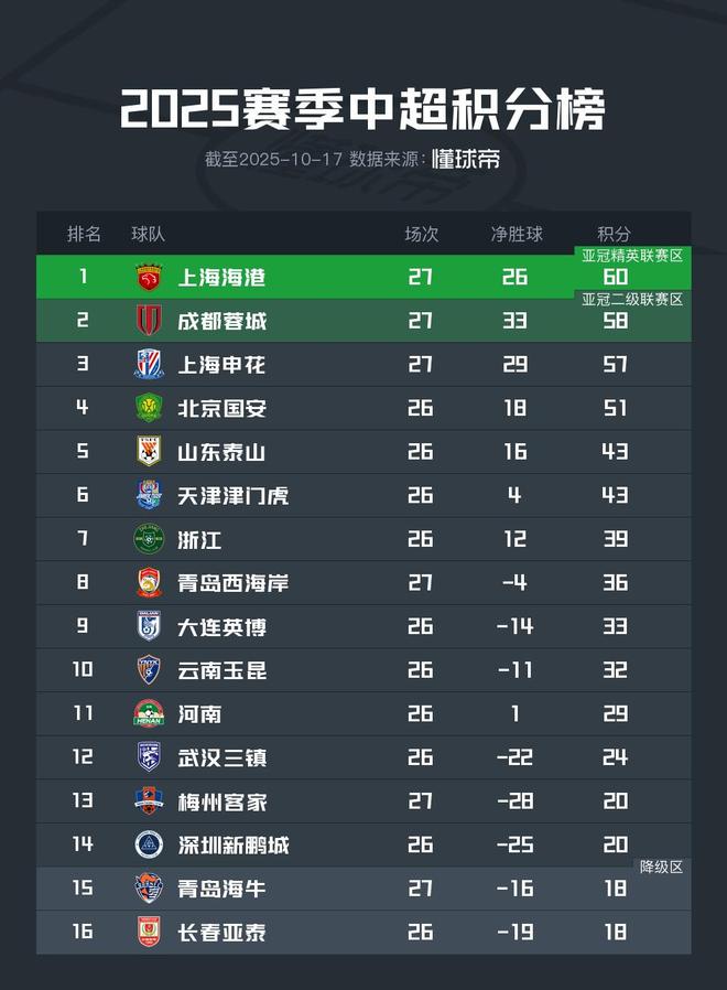 中超最新積分榜:海港60分位列榜首,成都58分仍居第二