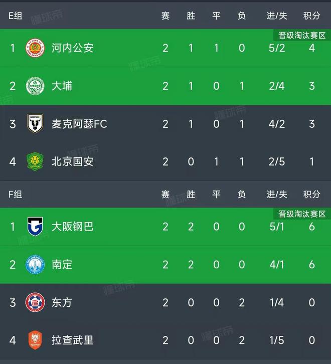 亞冠二級積分榜:國安2輪1分小組墊底,河內(nèi)公安4分領(lǐng)跑