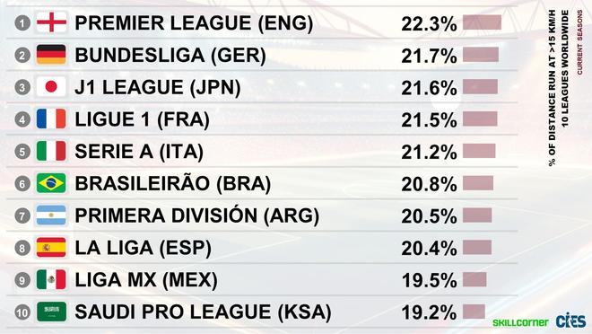 各聯(lián)賽高速跑動距離占比:英超居首,J1第三,西甲僅第八